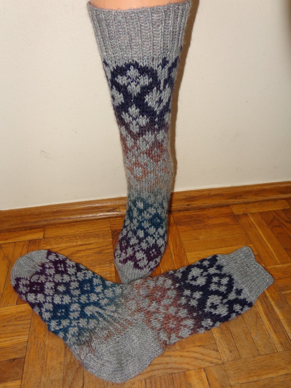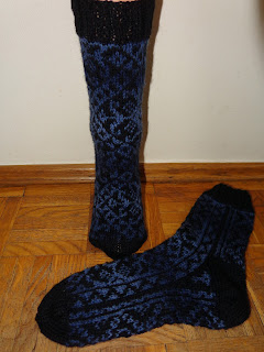 Najpierw okazało się, że to, co mi się pierwotnie wydawało żadnym problemem, problemem jednak jest - nie da się wzoru symetrycznego w pionie, nie w poziomie, robić "na pamięć", trzeba cały czas patrzeć w rozpiskę. A taki był właśnie wzór na grzbiecie stopy. Kiedy wieczorem w niebieskich przejściach tonalnych dotarłam do granatu, wpadłam w czarno-granatową rozpacz, rzuciłam druty i postanowiłam poczekać do rana - niestety, oczy nie te, nie dość, że w czerni wieczorem nie widzę i co chwilę ucieka mi któreś oczko, to już zupełnie nie odróżniam jej od granatu.