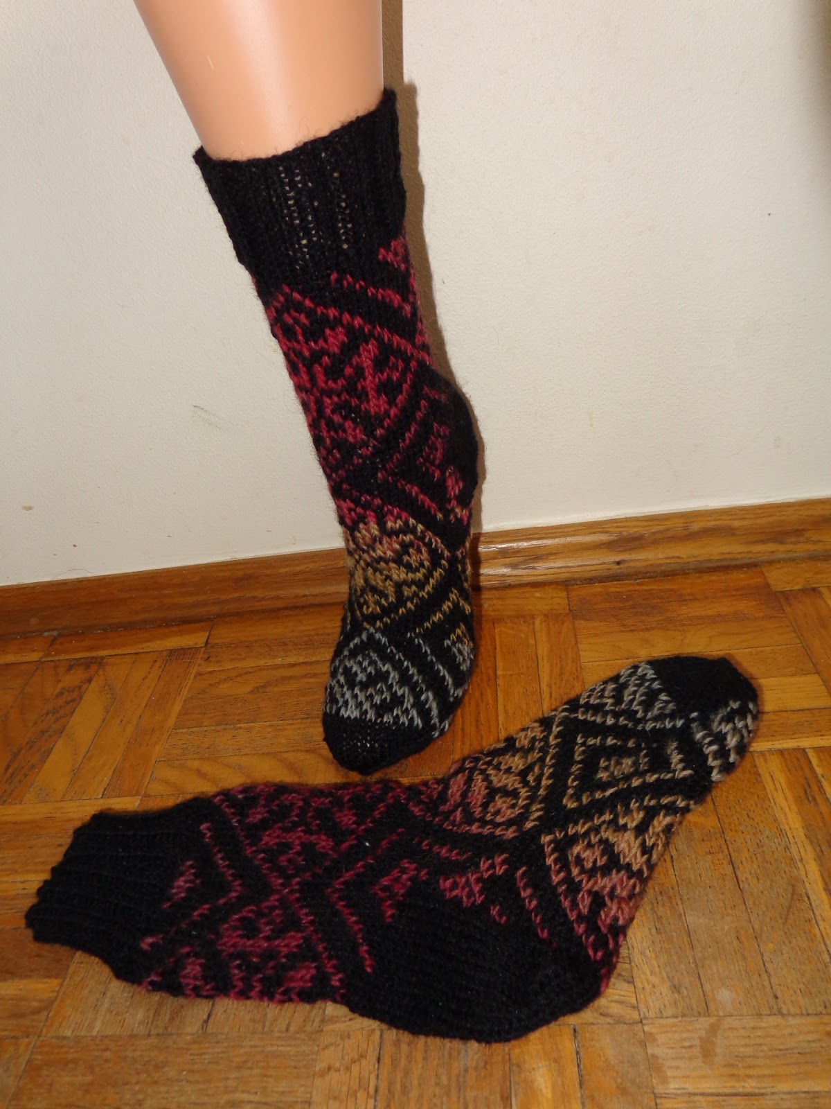 Nie, skarpetki nie są dodatkiem do komina, który pokazywałam dwa tygodnie temu. Powstały, bo po pierwsze tak złożony wzór był pierwotnie pomysłem na skarpetki właśnie, po drugie okazało się, że mój ojciec chciałby ciepłe skarpetki.