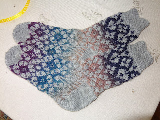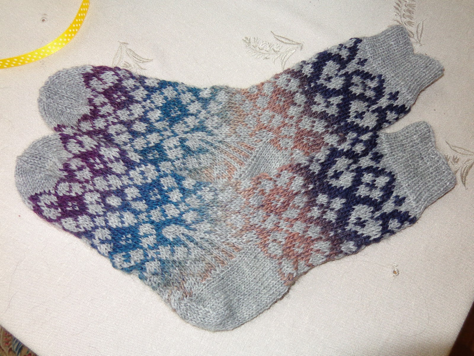 Darunter Socken mit Musterfragmenten von hier und mit dem grässlichen Delight von Drops - in dem Knäuel wiederholt sich kein einziges Farbabschnitt und das Garn ist dazu überdreht.